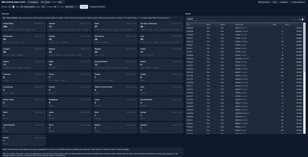 Over the past few weeks, I’ve been developing a companion tool to the UK HF Propagation Dashboard, a new page called the RBN Dashboard. This addition focuses on visualising real-time amateur radio activity reported through the Reverse Beacon Network (RBN).